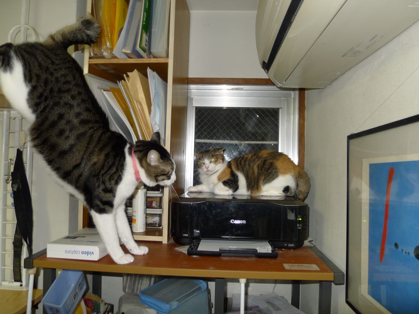The calico cat on the printer was named to "Choo" — which is slang for “kiss” in Japanese. She was fully adult when Ichi arrived as a kitten— and she didn't want to play.