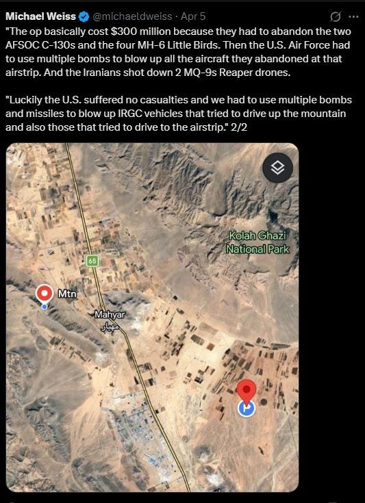 Many have pointed out that this whole debacle does at least prove that Iran has been attrited to such a degree as to allow the US to now fly deep missions into central Iran, including with troops, which are able to get in and out without dying.